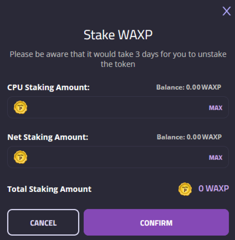 • Click the “STAKE WAXP” button. Enter the amount of WAXP you want to stake.